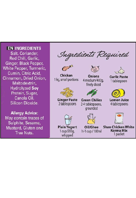 Shan Foods Chicken White Korma Masala Seasoning Mix is the perfect way to recreate the rich, creamy, and mild flavors of traditional Korma. Designed for making a delicious chicken dish in a velvety white onion and yogurt sauce, this spice mix brings the authentic taste of Indian cuisine right to your kitchen. Made with high-quality ingredients like coriander, garlic, ginger, black pepper, and turmeric, Shan Korma Masala enhances the natural flavors of chicken, offering a satisfying meal. This premium Shan masala mix is crafted from the finest spices, making it an easy-to-use seasoning blend for mouthwatering chicken korma. The combination of cumin, cinnamon, and dried onion creates a unique, balanced flavor profile that elevates your cooking. Perfect for both novice and experienced chefs, this Korma seasoning mix ensures your chicken korma will always be tender and flavorful, just like a traditional Mughlai dish. Shan's Chicken White Korma Masala is an essential pantry staple for those who love authentic Indian flavors. Whether you're cooking for family or guests, this versatile spice mix is perfect for making chicken korma and works well with other meats too. The seasoning is free from preservatives and artificial colors, ensuring pure, natural flavors. It's also vegetarian-friendly, making it suitable for various dietary needs. Conveniently packaged in a 40g pack (also available in a 3-pack option), this spice mix allows you to create rich, creamy korma whenever you wish. With no added preservatives or artificial colors, Shan provides an all-natural spice experience. Shan Foods Chicken White Korma Masala is a must-have for any kitchen, adding the right balance of flavors to your Indian-inspired dishes. Enjoy a rich, mouthwatering chicken curry that your family and guests will love with Shan Korma seasoning mix.