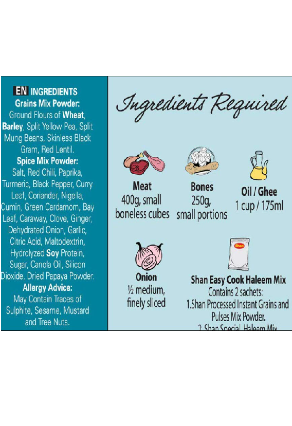 Haleem is staple dish in Pakistani/Indian Cuisine but it takes a considerable amount of time to prepare. Shan Foods has created a unique recipe mix packaged in a box with 2 packets: (i) Grains mix powder and (ii) Spice mix powder. Shan Easy Cook Haleem Mix has the perfect proportion of powdered lentils, wheat and spices to help you prepare the traditional creamy and grainy Haleem Curry