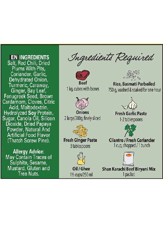 Shan Foods Karachi Beef Biryani Masala Mix delivers an authentic, rich, and aromatic flavor for a perfect beef biryani. Our biryani spice mix is expertly crafted to recreate the traditional Indian biryani taste, making your home-cooked meal truly extraordinary. Shan biryani masala is a blend of handpicked, high-quality ingredients like turmeric, garam masala, red chili, cumin, and more, providing the ideal seasoning for your beef pilaf. Ideal for preparing hot and spicy beef biryani, this biryani masala powder enhances the flavor of your biryani rice or layered meat pilaf, creating a deliciously satisfying dish. Whether you’re making chicken biryani, meat biryani, or vegetarian biryani, Shan biryani spice mix will bring out the best in your dish. The biryani mix is vegetarian-friendly, free from artificial colors and preservatives, ensuring a healthy, authentic experience. Our biryani masala is perfect for meat masala lovers who want to experience the perfect balance of spices. The mix is easy to use and can be stored in an airtight box to preserve its freshness, making it a convenient pantry essential. Add this aromatic spice blend to your cooking to elevate your culinary skills and serve up a rich, flavorful biryani that everyone will love. Perfect for special occasions or everyday meals, Shan biryani masala brings the taste of India right to your kitchen. With no preservatives or artificial food color, Shan masala provides an authentic and natural flavor profile, perfect for those who prefer indian spices in their meals. This spice mix is a go-to solution for creating flavorful, aromatic biryanis and is a must-have for anyone passionate about Indian cuisine.