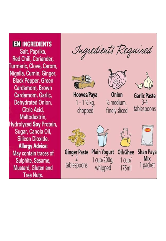 Shan Foods Paya Recipe & Seasoning Mix offers the perfect blend of aromatic spices to help you create the traditional and flavorful meat curry everyone loves. Specially formulated to enhance the taste of tender meat and trotters curry, this seasoning mix ensures your dish is full of rich and vibrant flavors. Packed with meat tenderizer seasoning, it is ideal for achieving tender and succulent meat in every bite. Whether you're preparing a hearty meat stew, a flavorful meat tenderizer spice rub for grilling, or seasoning your favorite curry, Shan's seasoning mix works wonders. It’s a salt-free meat tenderizer that enriches your dishes without the added sodium, making it perfect for those seeking healthier cooking options. The spices in Shan's mix, including coriander, turmeric, ginger, cumin, and cardamom, are known for their ability to tenderize meat while enhancing flavor. For meat lovers and vegetarians alike, this seasoned meat mix can be used for various recipes, including seasoning for grilling, meatloaf, and beef tenderizer dishes. It’s a must-have for those who enjoy cooking with rich, aromatic spices and herbs. This versatile mix also serves as an excellent spice rub for beef, chicken, and grilled meats, making your meals flavorful and tender. Shan Foods ensures every packet of this meat seasoning mix contains premium-quality ingredients like paprika, clove, nigella, and garlic, with no artificial food colors or preservatives. Whether you are preparing a meatloaf seasoning mix or just seasoning fresh meat, Shan’s Paya seasoning provides an authentic, easy-to-use spice blend that brings out the best in any recipe. The airtight packaging ensures your spices remain fresh, allowing you to enjoy the traditional flavors whenever you need them.
